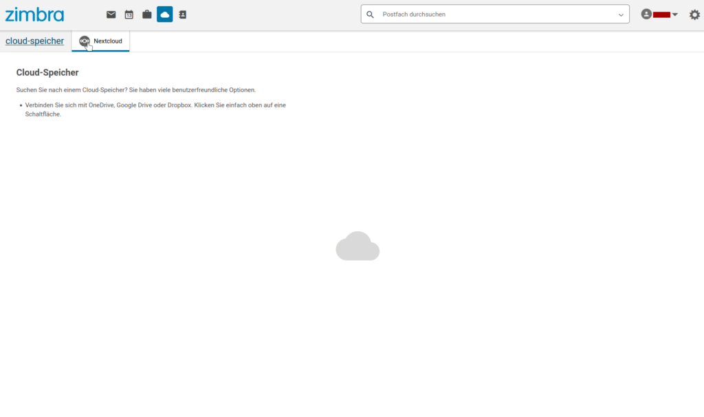 - Zugriff auf den Menüpunkt „Cloud Speicher“ im Zimbra Webmailer