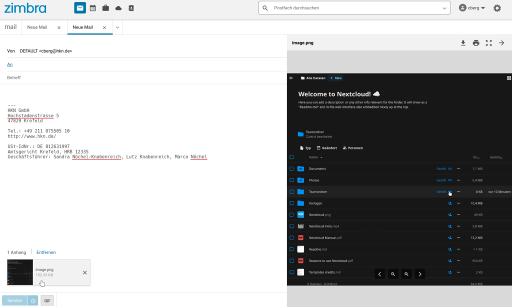 Die Integration von Nextcloud in Zimbra ermöglicht es, Dateien direkt über E-Mails zu versenden oder zu teilen. Das erleichtert nicht nur die Zusammenarbeit, sondern sorgt auch für effizientes Datenmanagement, reduziert Speicherbelastungen und bietet Kontrolle über Berechtigungen.