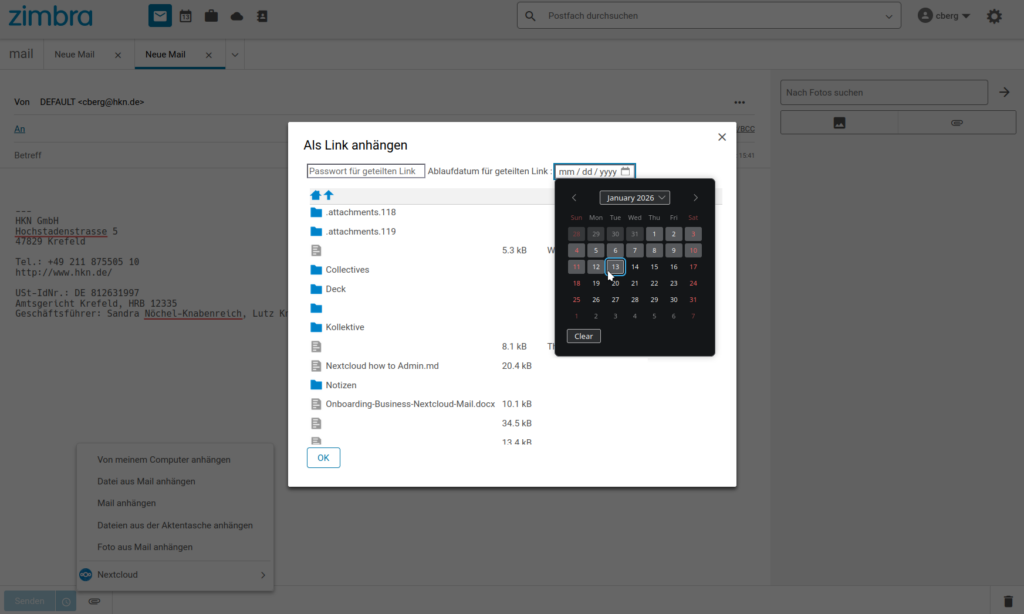 - Dateien werden als Nextcloud-Link versendet, nicht direkt angehängt.