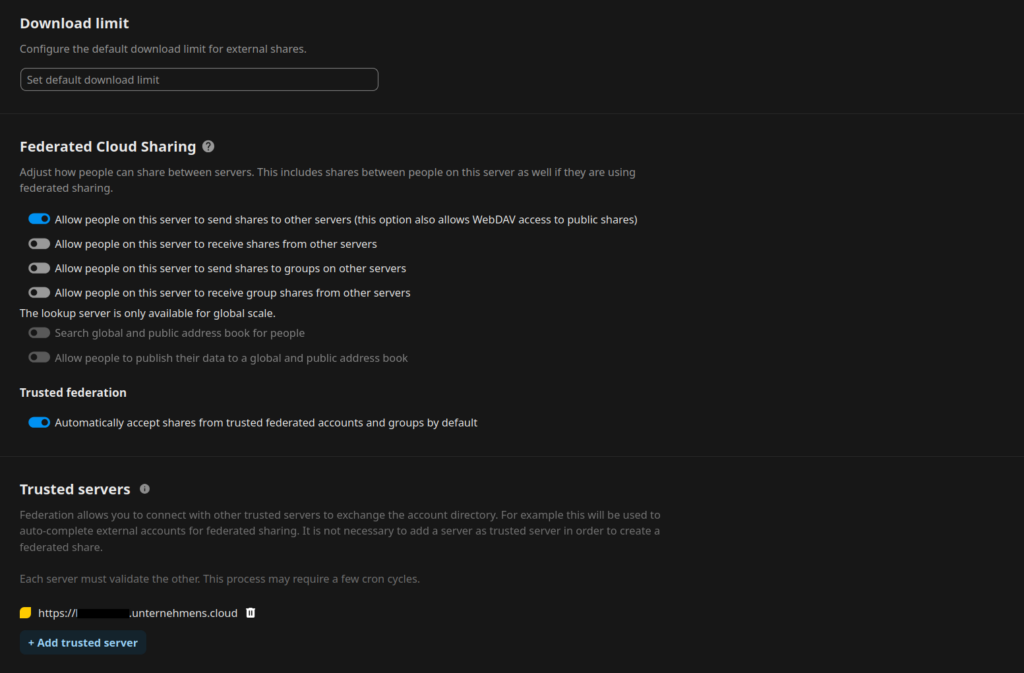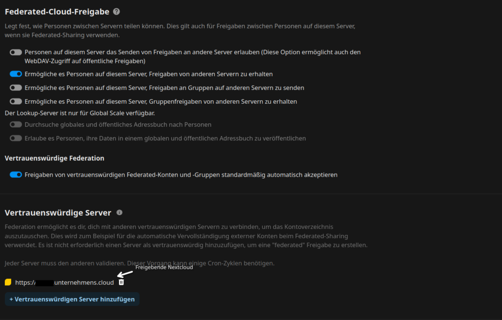 Der Administrator der empfangenden Nextcloud muss ebenfalls sicherstellen, dass Federation-Freigaben erlaubt sind. Andernfalls funktioniert die Freigabe nicht.
