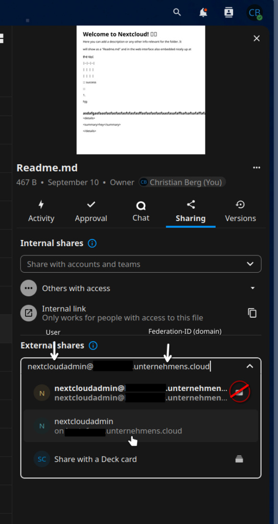 Die Federation ID setzt sich aus dem Benutzernamen und der Domain der Nextcloud zusammen (z. B. nutzer@nextcloud.example.com).- Du findest deine eigene Federation ID in deinen persönlichen Einstellungen unter dem Menüpunkt Teilen.